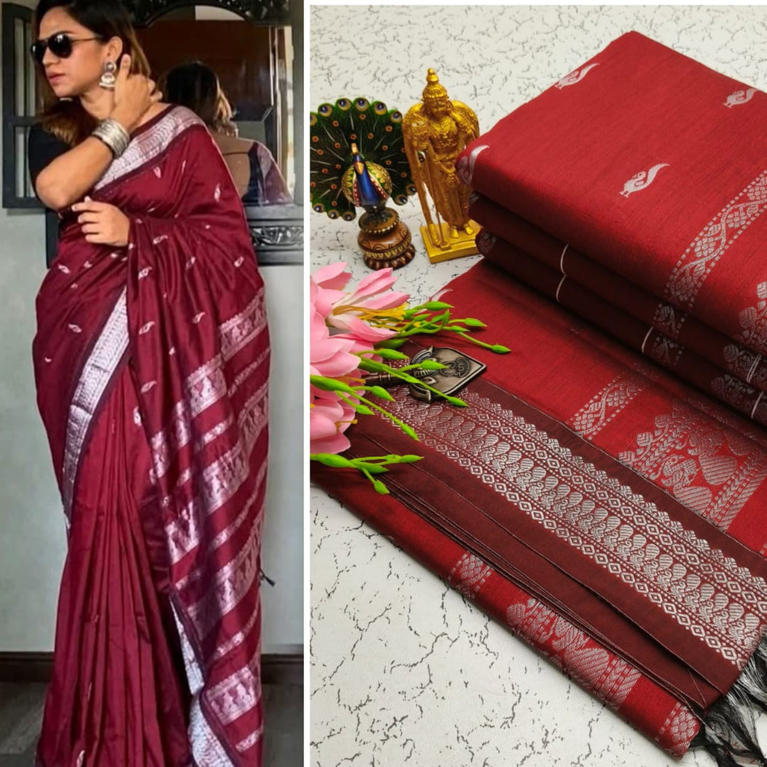 Description:This elegant Kalyani Cotton Saree features a deep red base adorned with graceful silver zari...